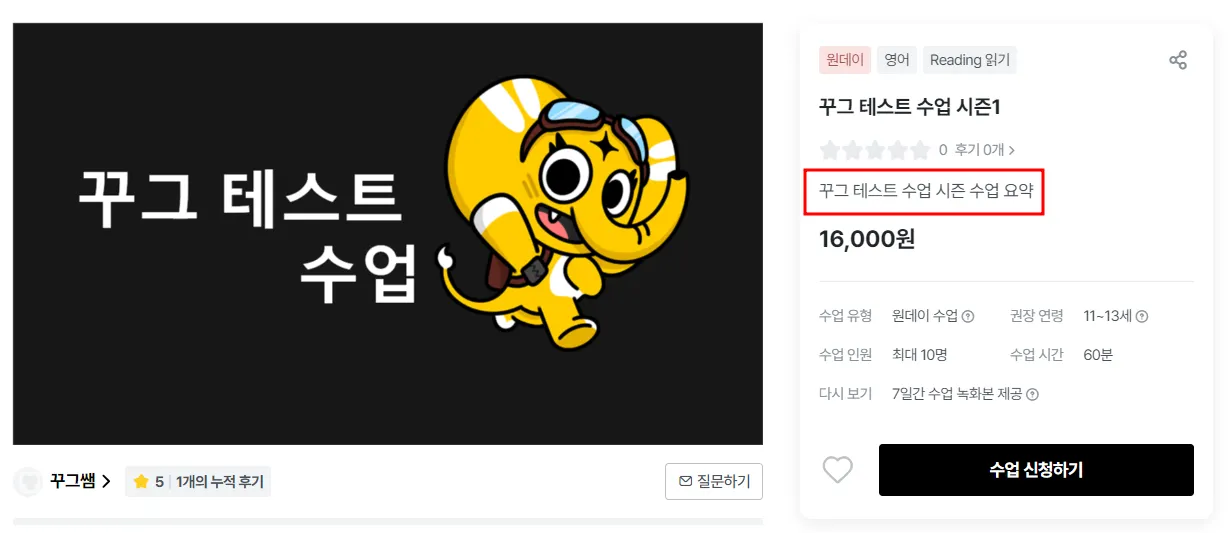 수업 한 줄 요약은 수업 상세페이지 제목 바로 아래에 위치하며, 부제 역할을 합니다.