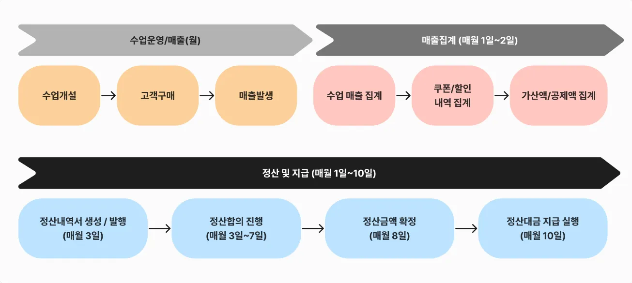 사업자 정산은 개인 사업자 혹은 기업 소속의 선생님의 수업 운영으로 발생한 매출 정산이 회사로 일괄 지급되는 방식을 말합니다.