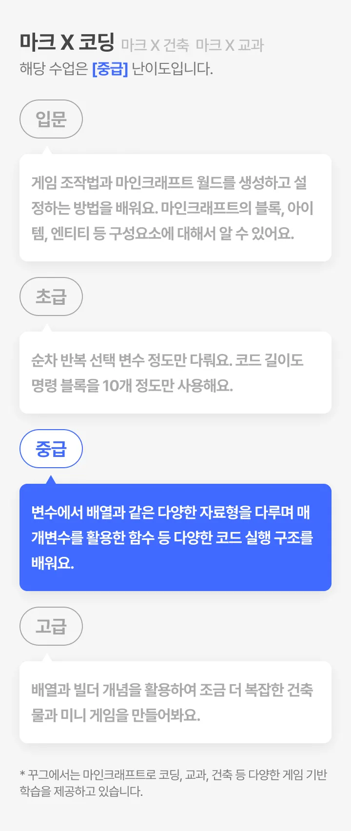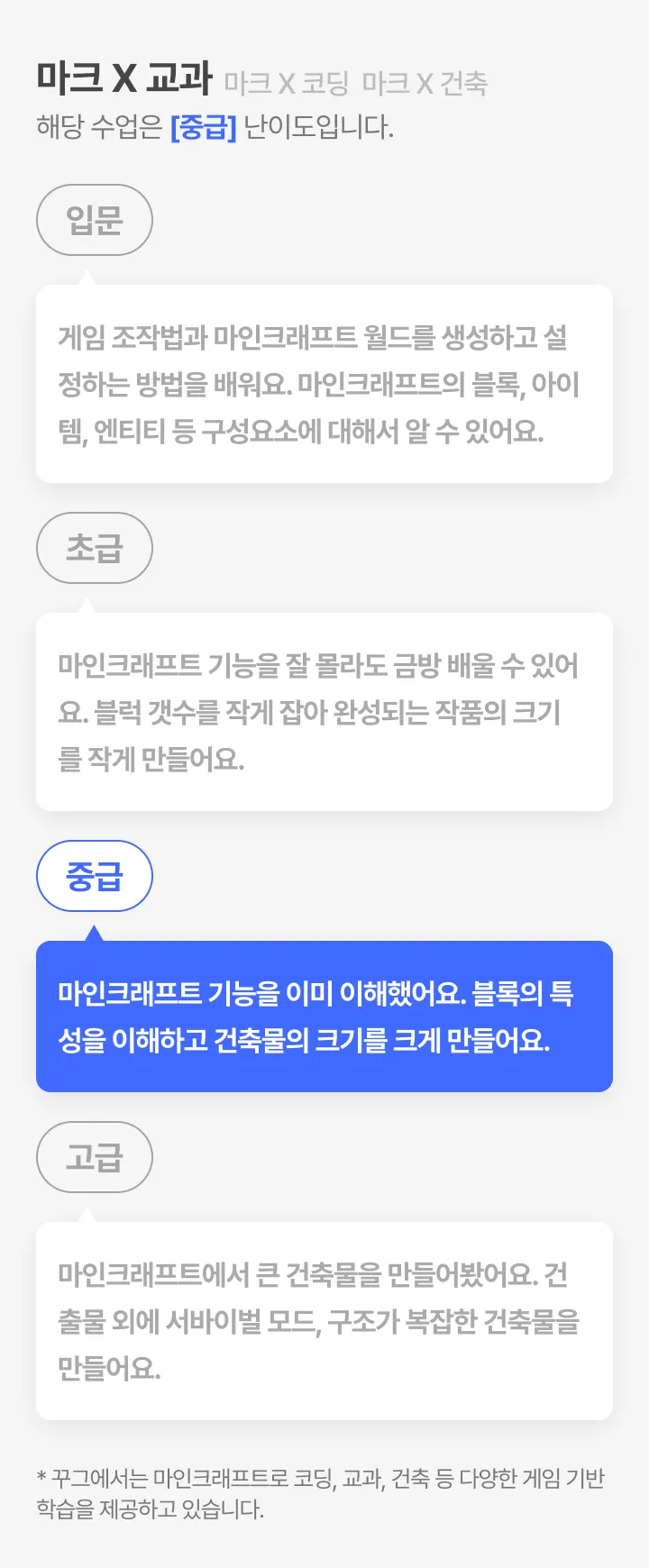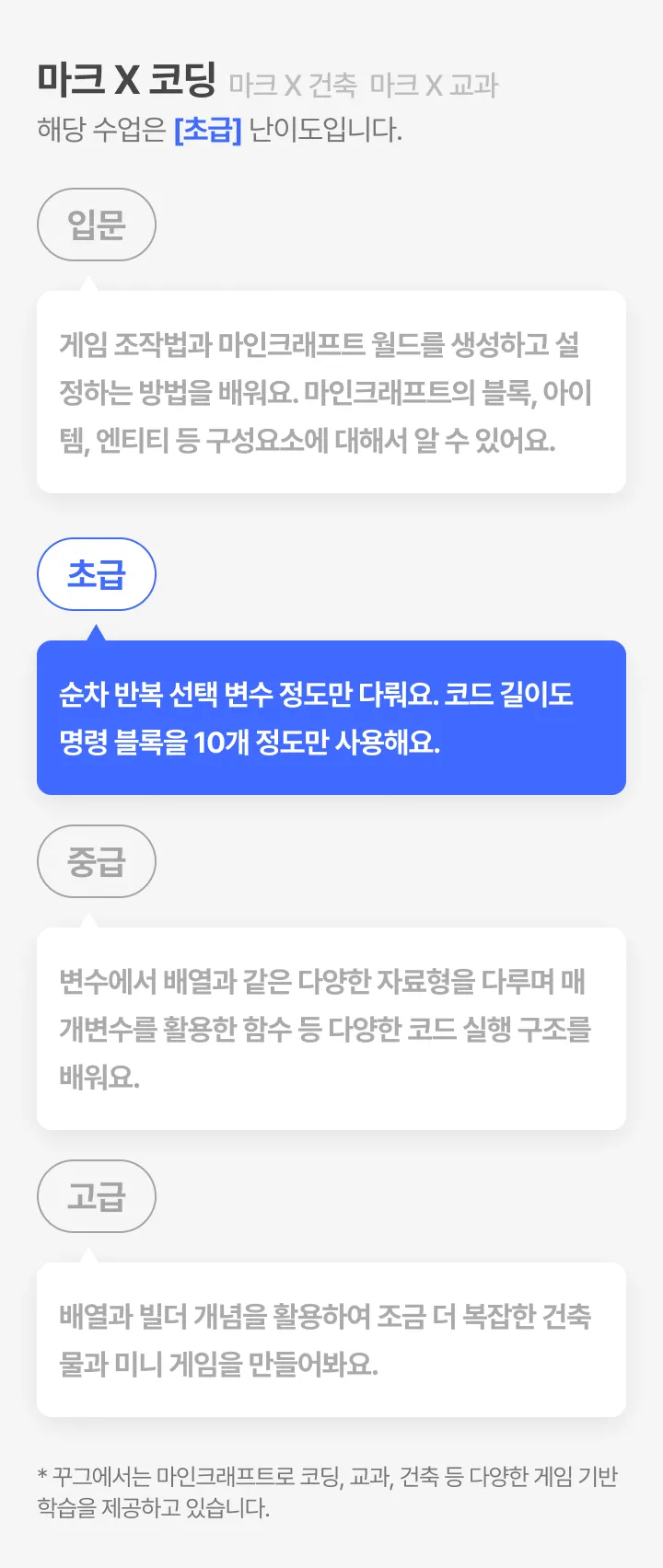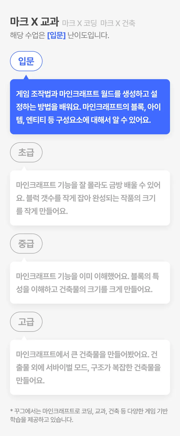 마인크래프트 수업의 경우, 꾸그의 난이도를 바탕으로 수업의 난이도를 작성하시는 것을 권장드립니다.