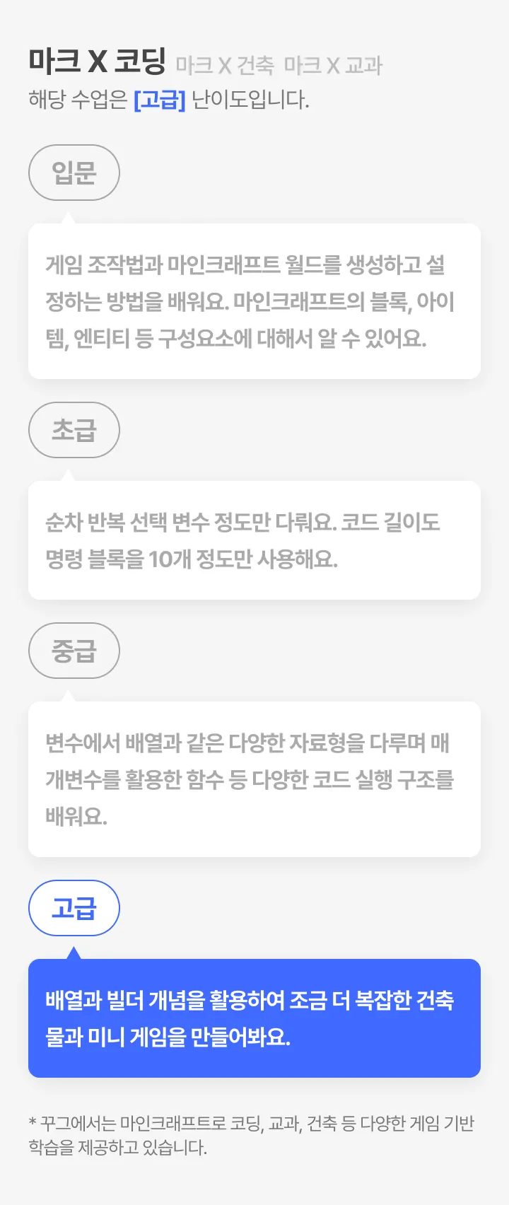 꾸그의 마인크래프트 수업 난이도에 대한 상세 설명은 아래에서 확인하실 수 있습니다.