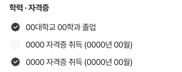 인증은 작성한 학력 · 자격증의 항목 별로 진행되며, 승인된 항목은 인증 표기가 활성화됩니다.