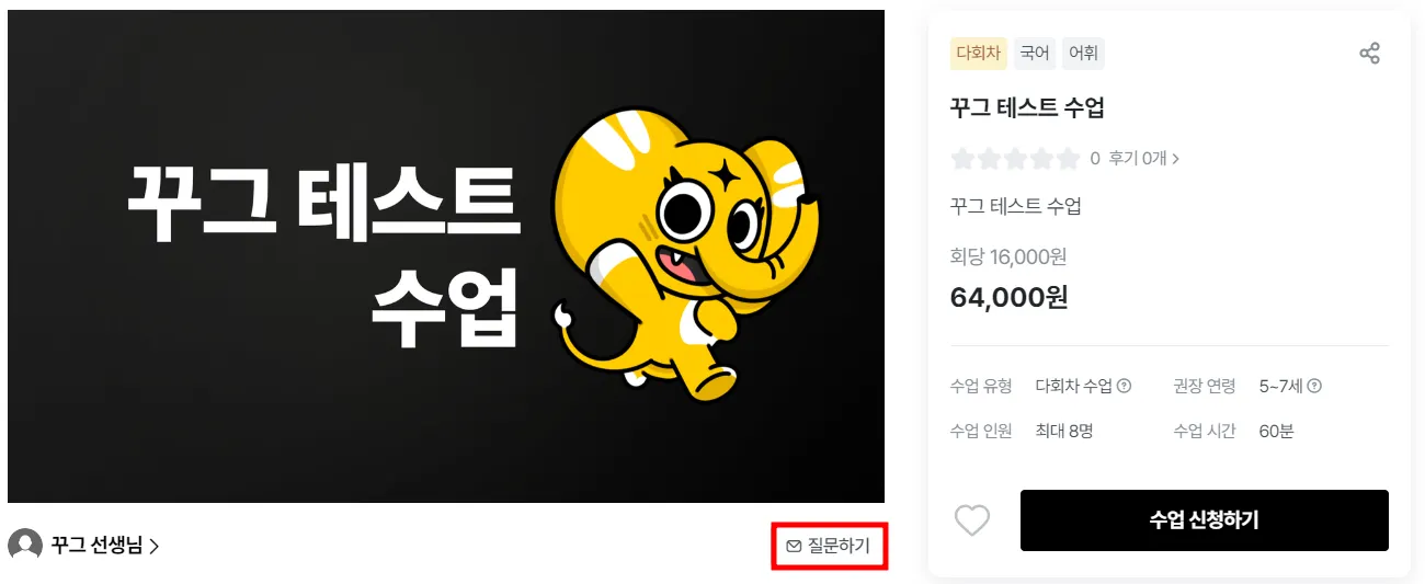 선생님께 개인적으로 문의드리거나 의견을 전달하고 싶으시다면 수업 상세 페이지 상단에 있는 [질문하기] 버튼으로 대화를 보내실 수 있어요.