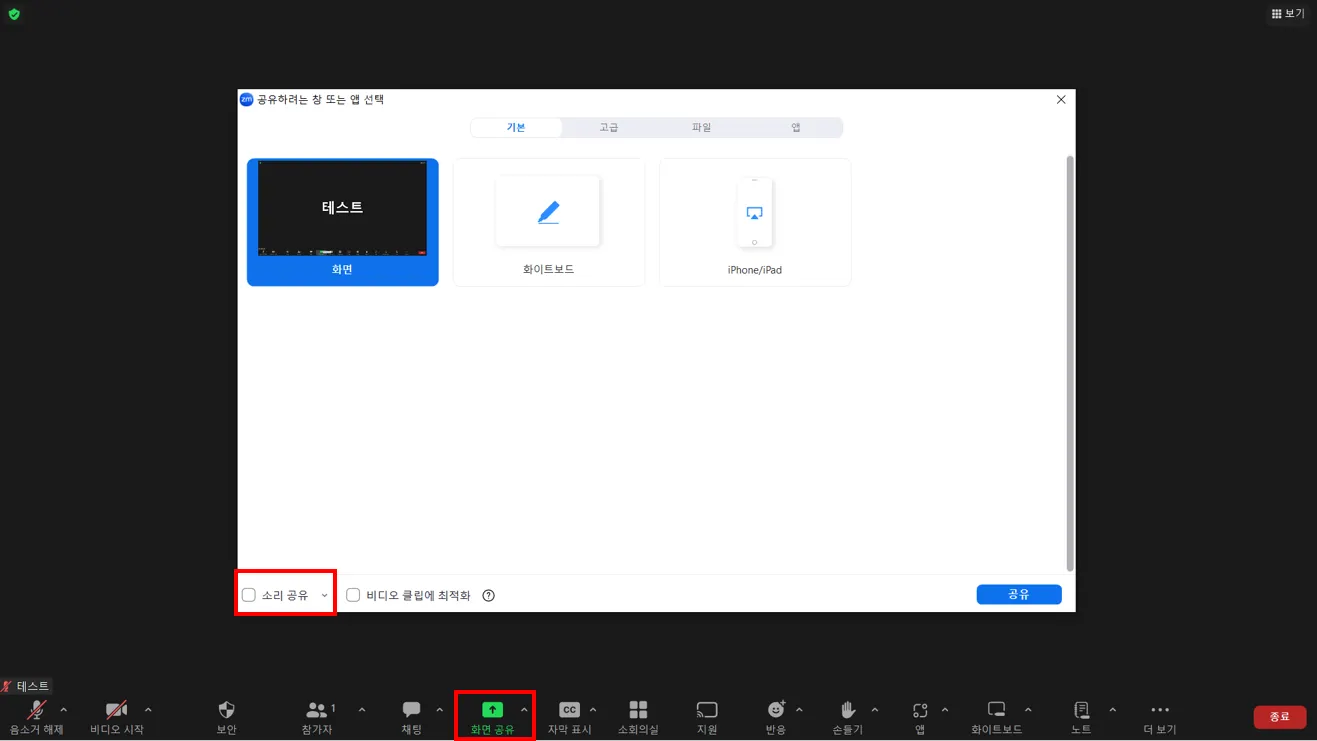화면 좌측 하단 소리 공유 설정을 체크해 주시면 화면 내 소리 또한 함께 공유할 수 있습니다.