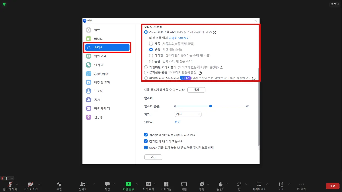 수업에서 악기를 활용하실 예정이라면 악기 소리와 선생님의 음성이 잘 전달되도록 오디오 설정이 필요합니다.