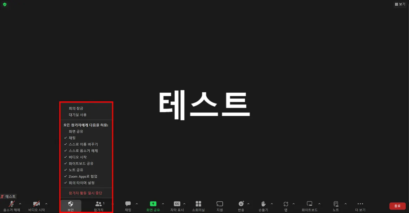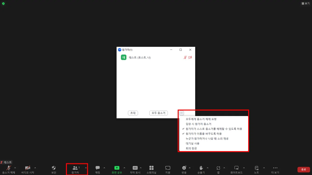 참가자의 화면 공유, 채팅, 이름 바꾸기, 음소거 해제 권한 등 설정할 수 있습니다.