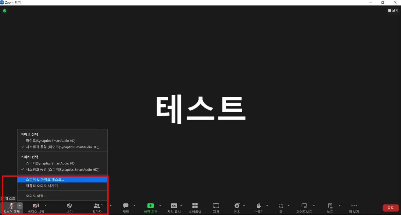 스피커 및 마이크 테스트는 [음소거 우측 ∧ > 스피커&마이크 테스트]를 통해 확인하실 수 있습니다.