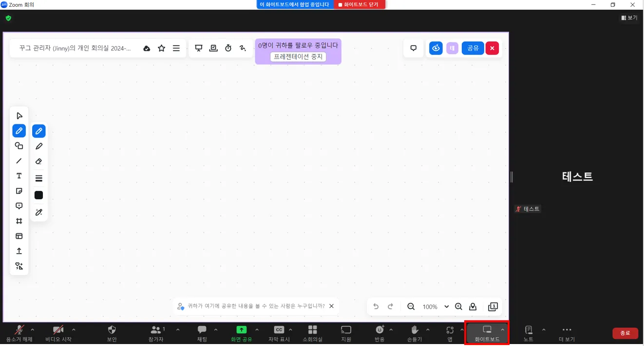 화이트보드 기능을 중단하고 싶다면 상단 ■화이트보드 닫기 버튼을 눌러주세요.