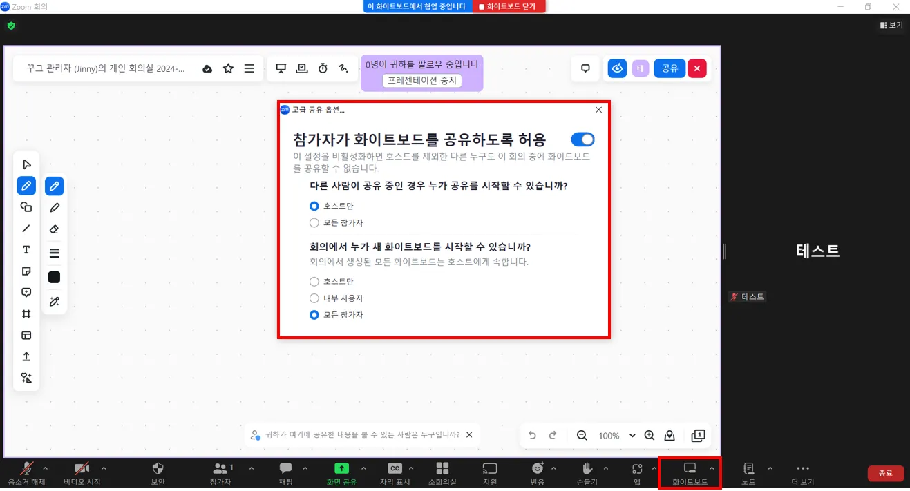 화이트보드 ᐱ 클릭 시 참가자가 화이트보드를 공유하도록 허용 설정을 확인하실 수 있습니다.
