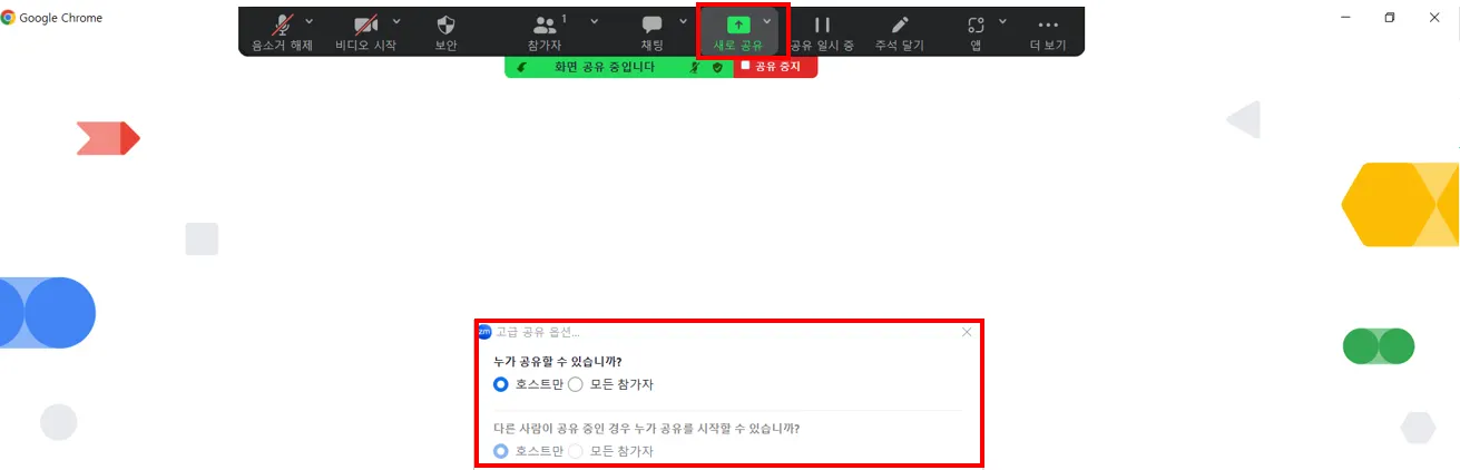 참가자들이 공유한 화면을 중단하고 싶다면 ■공유 중지 버튼을 눌러주세요.