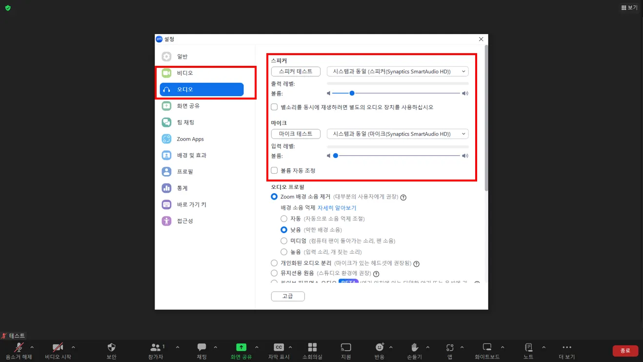 일반적으로 Zoom 회의실 입장 시 자동으로 스피커와 마이크가 연결됩니다.