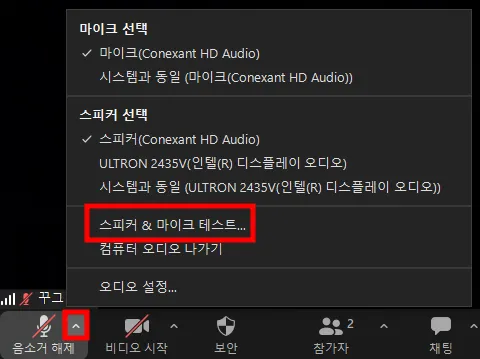[강의실 화면 하단 메뉴바 > 마이크 옆 화살표 > 스피커 선택]에서 선택하실 수 있으며, 아래 [스피커&마이크 테스트]를 직접 해볼 수 있으니 참고 부탁드려요.