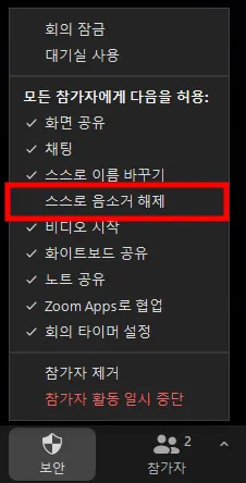 화면 공유, 채팅, 스스로 이름 바꾸기, 스스로 음소거 해제, 비디오 시작, 화이트보드 공유의 기능을 각각 활성화/비활성화 하실 수 있으니 참고해 주세요.