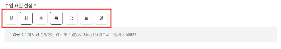 주 2회 이상 수업을 진행하고 싶다면 수업 요일을 추가로 선택해 주세요.