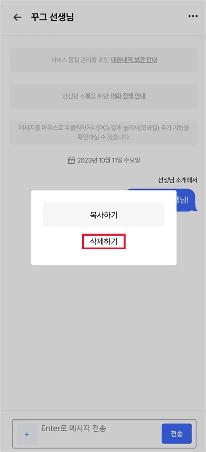 대화 메세지 삭제는 상대방의 읽음 여부와 관계없이 5분 이내에 전송했던 메세지만 삭제하실 수 있어요.