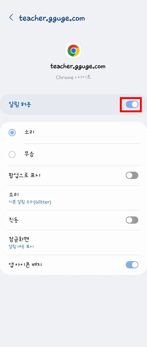 “티쳐꾸그”에서 알림을 보내고자 합니다.’ 팝업 화면 > 허용 클릭