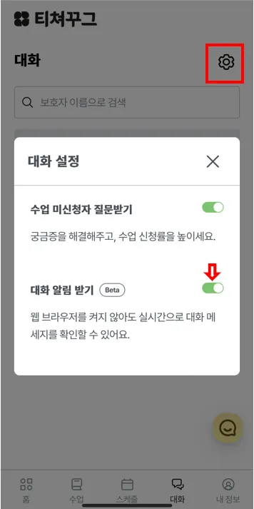 [크롬 브라우저 > 티쳐꾸그 홈페이지 > 우측 상단 대화 아이콘 > 우측 상단 톱니바퀴 아이콘 > 대화 알림 받기 설정 토글 > ON]을 통해 설정 가능합니다.