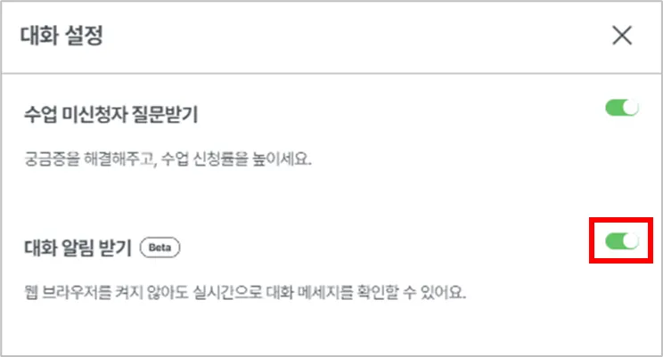 대화 알림 받기 설정 토글 > ON을 통해 설정 가능합니다.