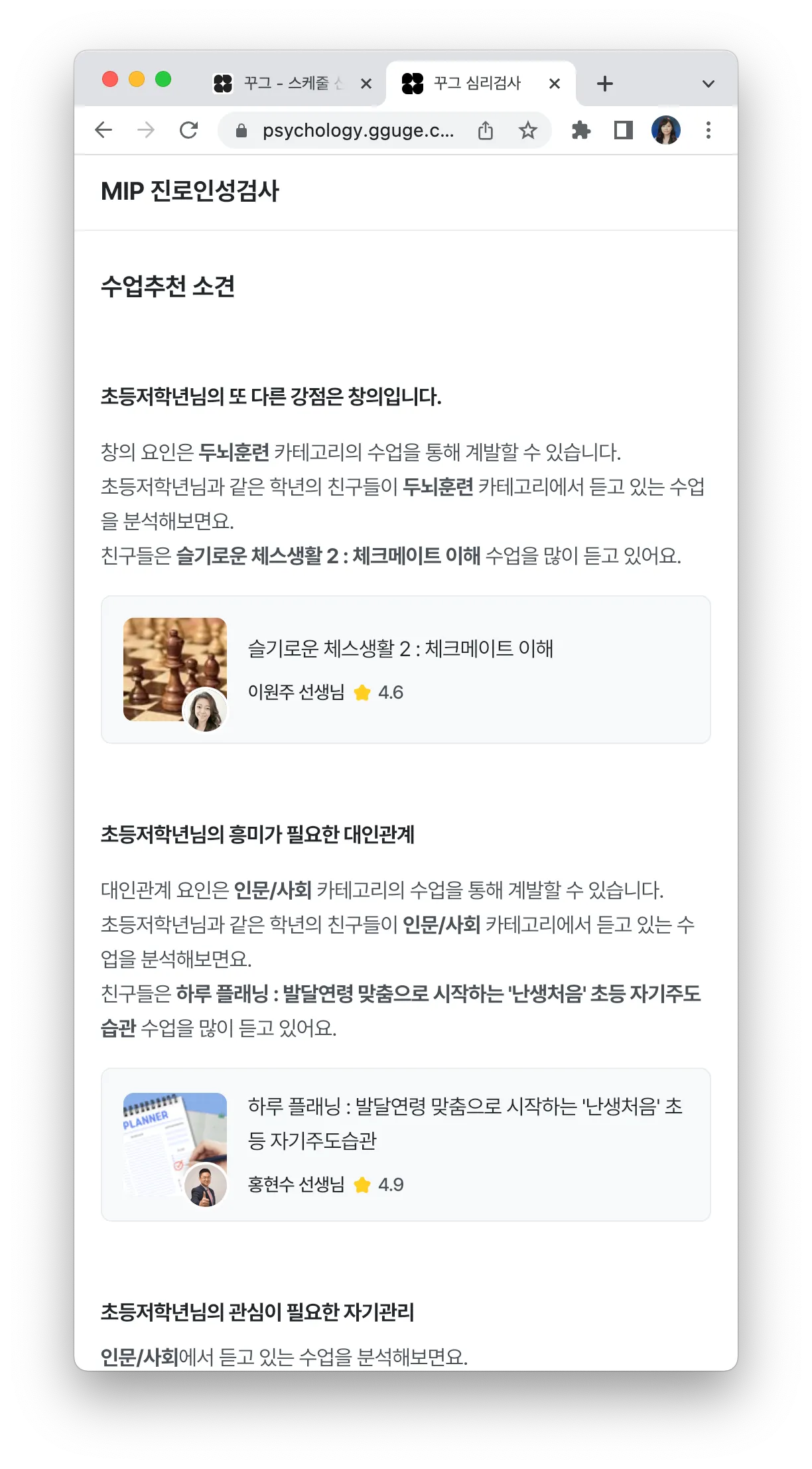 검사 결과 페이지 아래에는 결과를 토대로 하여 꾸그가 아이에게 추천하는 수업이 표기됩니다. 검사 결과와 함께 추천 수업도 확인해 보세요.