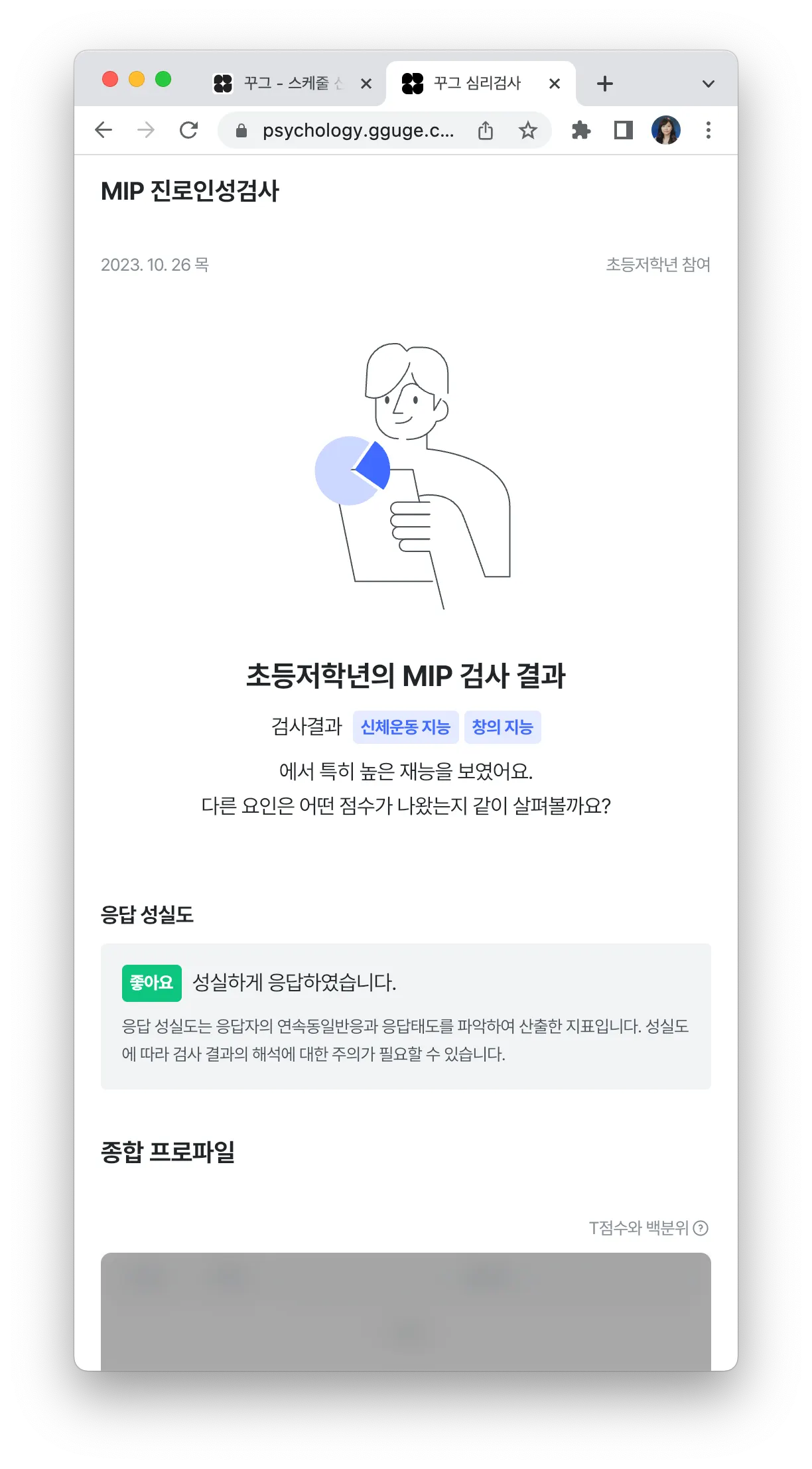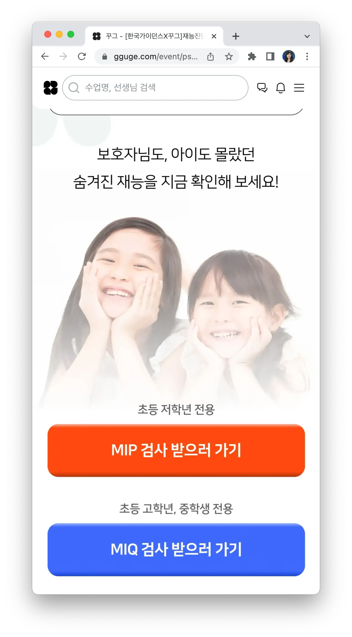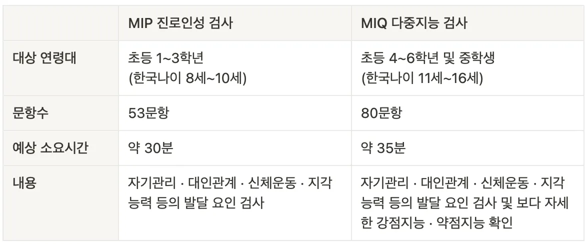 꾸그가 한국가이던스와 함께 준비한 두 가지 검사는 MIP(진로인성) 검사와, MIQ(다중지능) 검사예요. 검사 신청 페이지(링크)를 통해 검사 내용을 확인하고, 어떤 검사를 받아야 하는지 알아보세요. 두 가지 검사의 차이점을 한 눈에 보실 수 있도록, 다음과 같이 표로도 준비했어요.