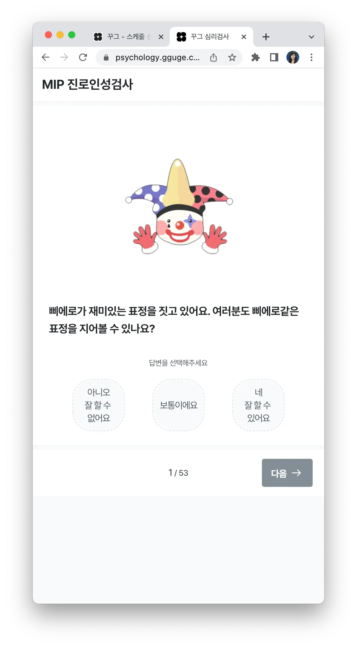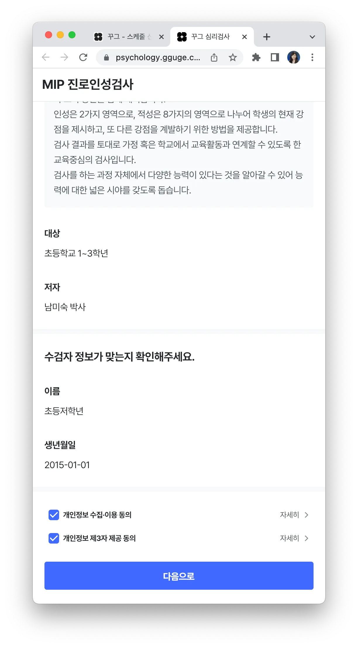 검사 링크로 접속하시면, 꾸그 심리검사 서비스 페이지에서 개인정보 수집 · 이용 및 제3자 제공에 동의하신 후 검사를 시작하실 수 있습니다. 수검자 정보가 올바른지 확인하신 후, [다음으로] 버튼을 눌러 검사를 시작하세요.