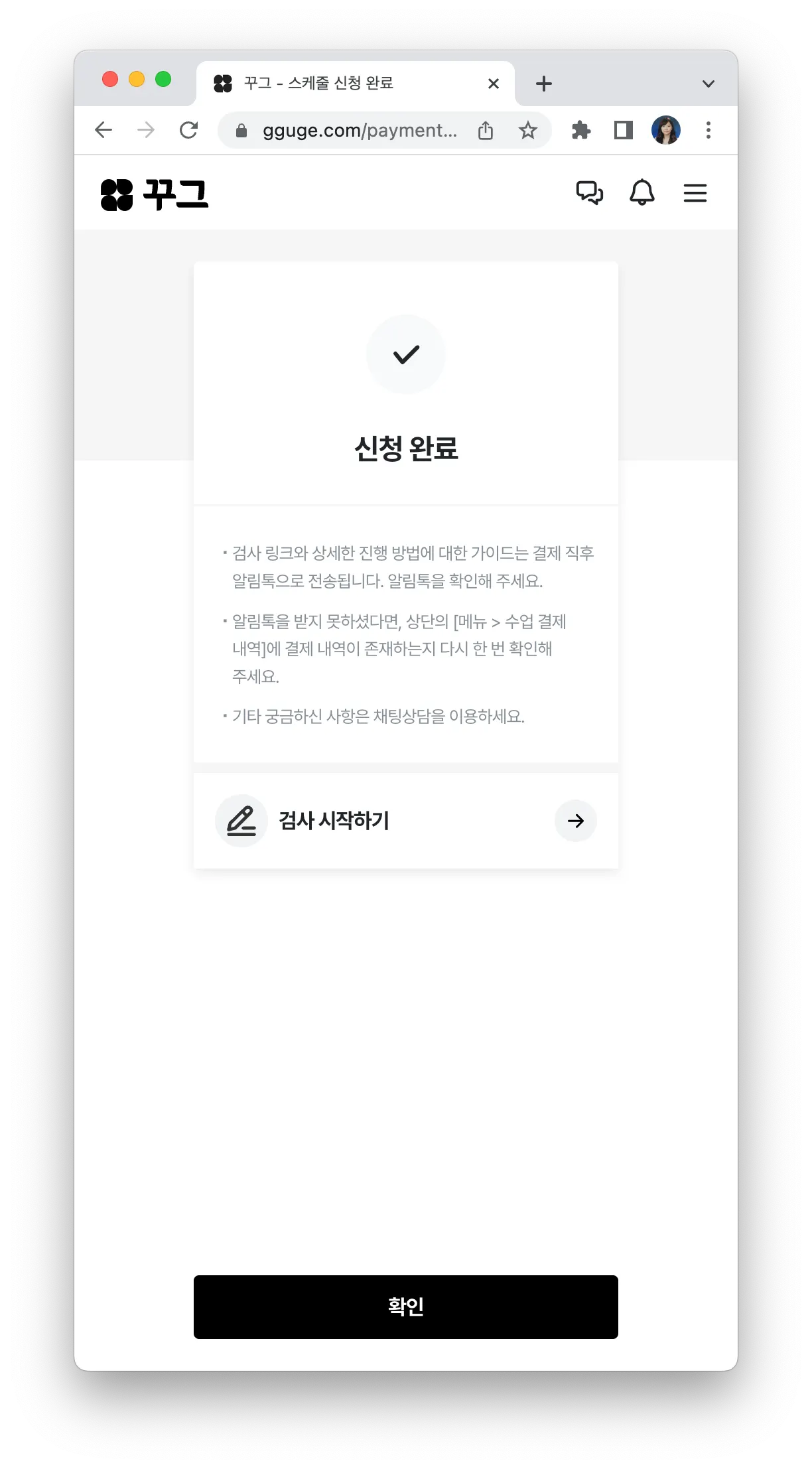 알림톡을 정상적으로 수신하기 어려운 환경이시거나, 검사 링크를 분실하신 경우, 꾸그의 [수업 결제 내역] 페이지를 통해서도 검사 링크를 확인하실 수 있어요. (단, 현재 꾸그 앱에서는 검사 링크 확인이 불가능합니다.)